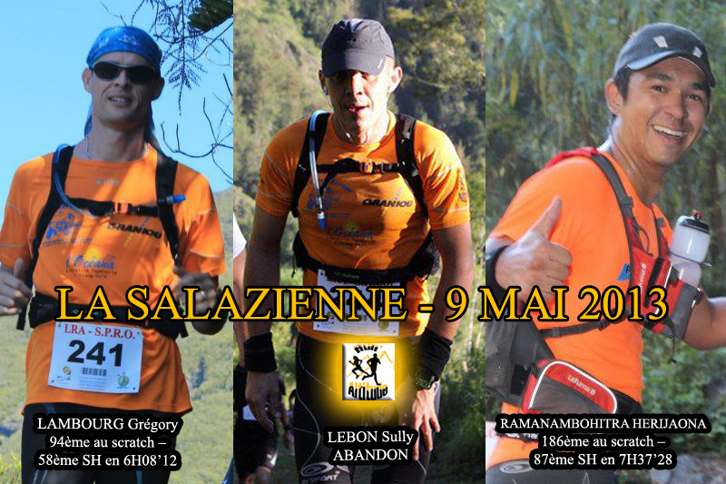 Une Belle course de la Salazienne ce jeudi 9 mai 2013. Bravo à nos finishers de Run'Altitude Greg et Héri. Notre ami Sully a abandonné suite à un soucis physique.